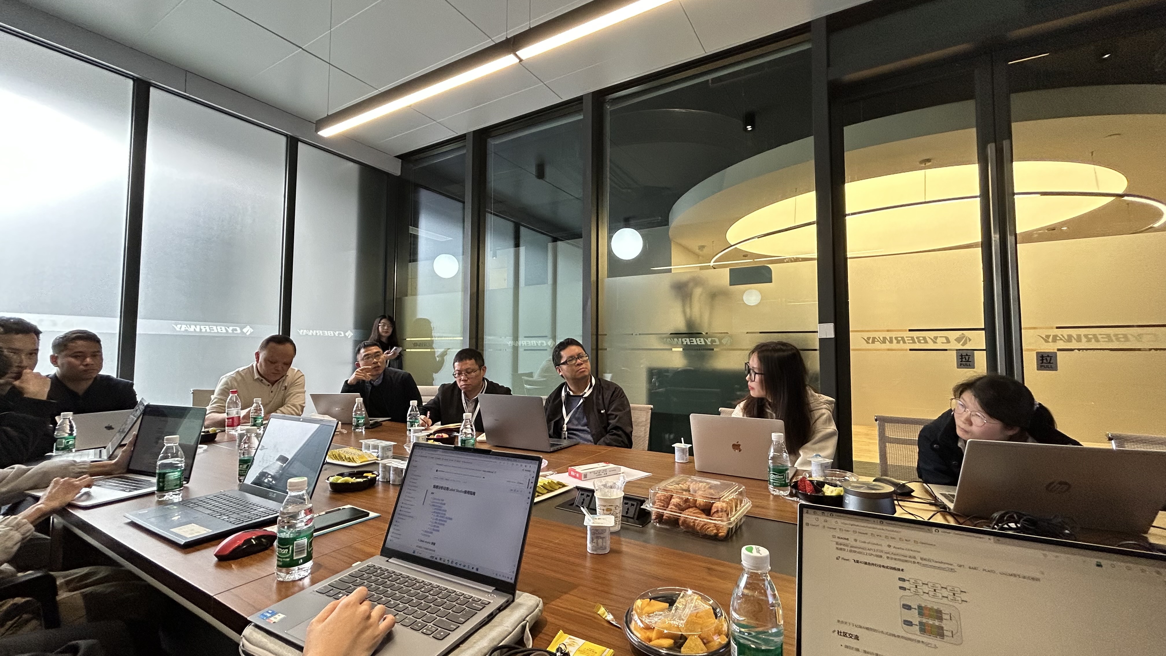 赛博威信息科技相关领导首先向来访师生介绍了公司的企业文化、合作项目等方面的情况,表达了对公司师生一行人的欢迎。谭军老师交流介绍了公司在开展校企合作、推动基础科学和应用技术融合、公司学科发展等方面的情况。他还引用了习近平总书记在全国院士大会的报告《努力成为世界主要科学中心和创新高地》的内容,鼓励员工努力科研、勇于克艰,在国家政策与公司制度对科研工作大力支持形势下,紧密结合国家、社会、企业的需求,推动校企合作在未来会研发出更好的人工智能创新性成果。
