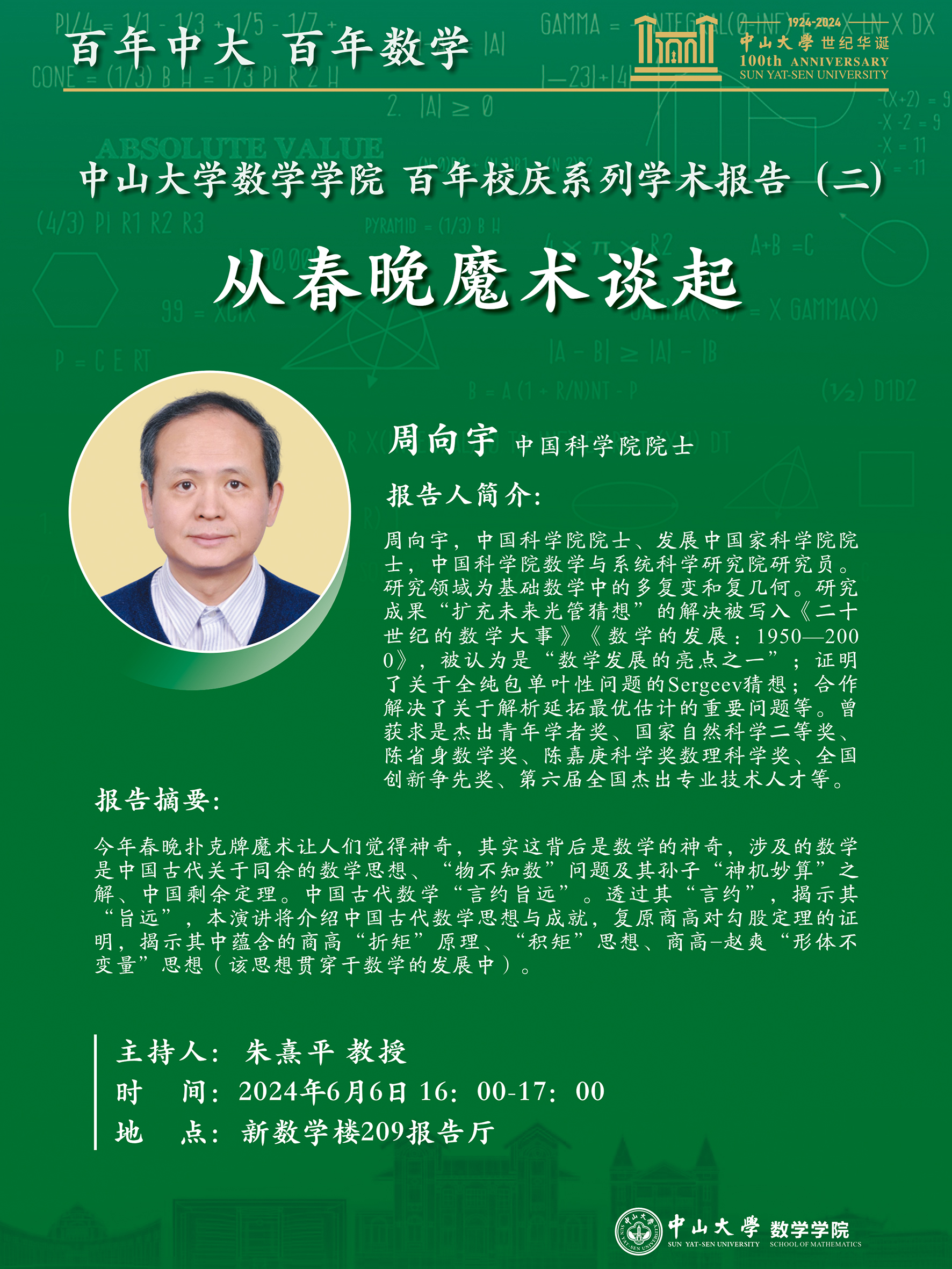 正逢太阳成集团tyc234cc百年华诞,为献礼百年校庆,回顾数学百年发展历程,传承良好学术传统,展望数学百年新出发,太阳成集团tyc234cc筹划“百年中大,百年数学”系列学术报告。