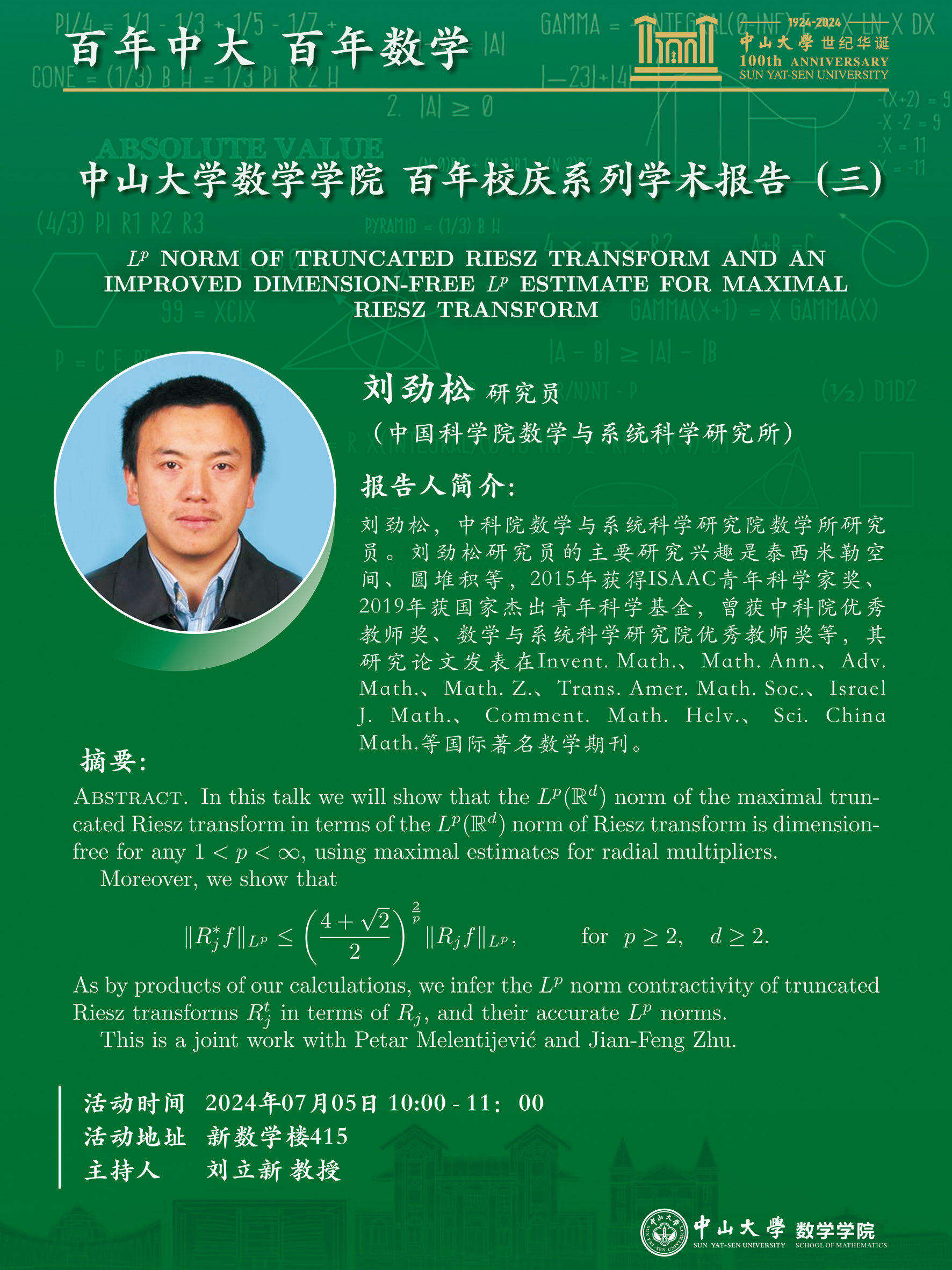 2024年7月5日,应公司刘立新教授和苏伟旭教授的邀请,中国科公司数学与系统科学研究院数学所刘劲松研究员在新数学楼415室作题为《LP NORM OF TRUNCATED RIESZ TRANSFORM AND ANIMPROVED DIMENSION-FREE LP ESTIMATE FOR MAXIMALRIESZ TRANSFORMAMM》的学术报告。