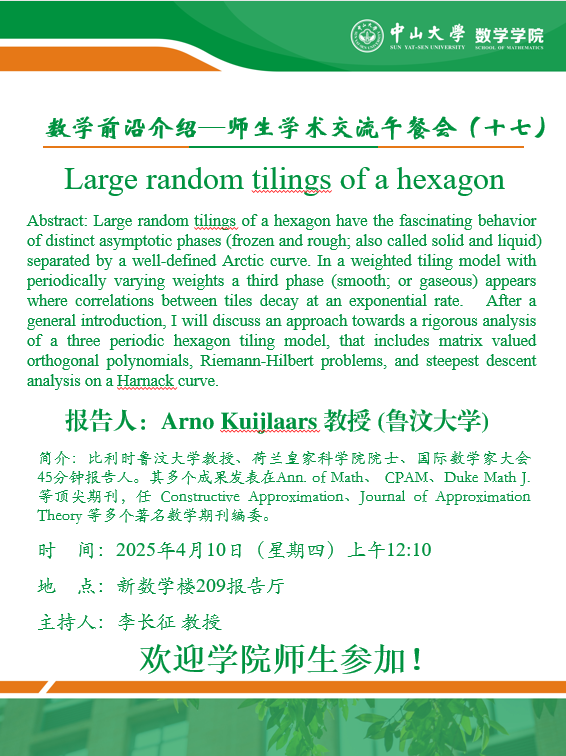 Abstract: Large random tilings of a hexagon have the fascinating behavior of distinct asymptotic phases (frozen and rough; also called solid and liquid) separated by a well-defined Arctic curve. In a weighted tiling model with periodically varying weights a third phase (smooth; or gaseous) appears where correlations between tiles decay at an exponential rate.