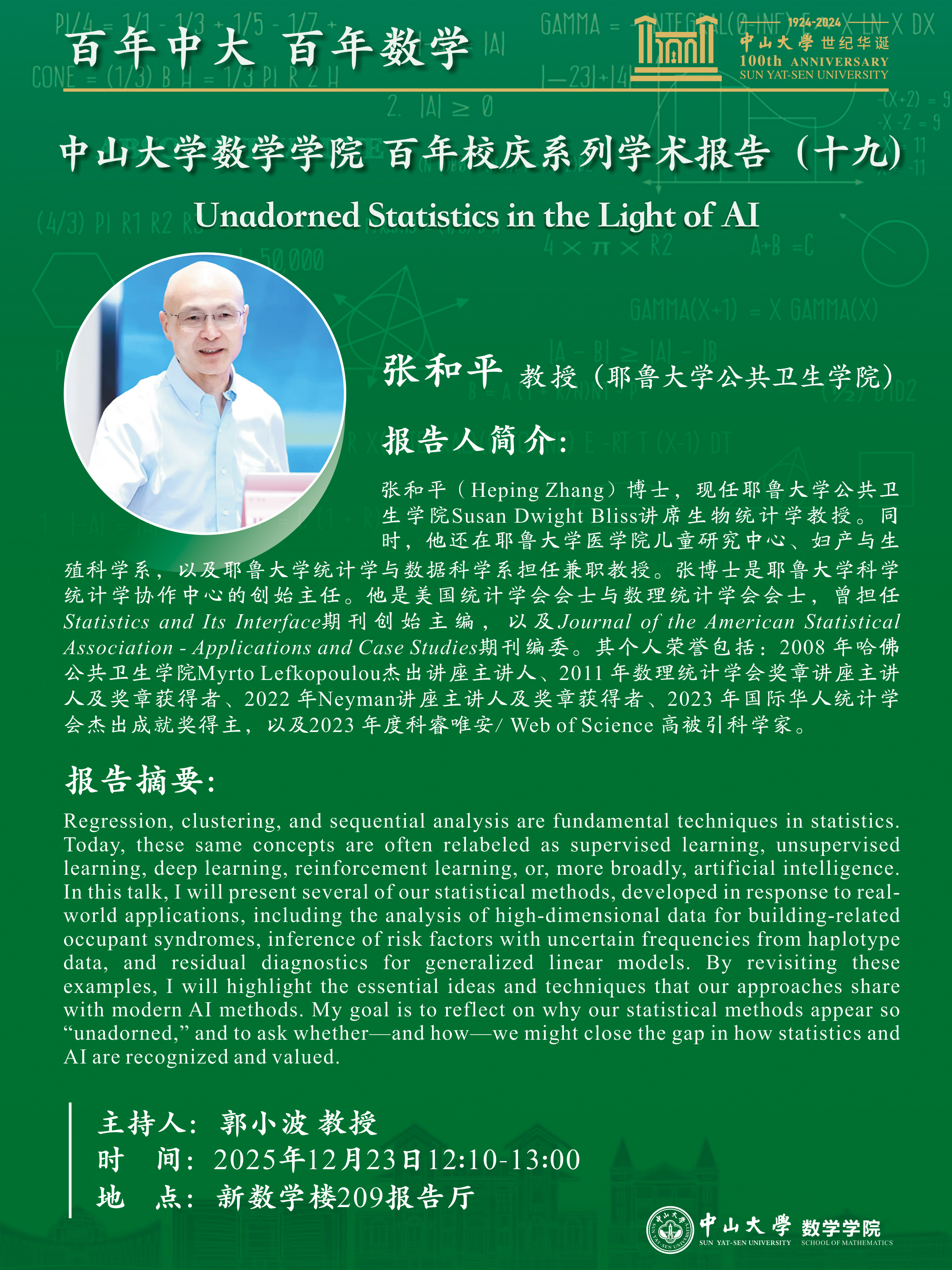 摘要: Regression, clustering, and sequential analysis are fundamental techniques in statistics. Today, these same concepts are often relabeled as supervised learning, unsupervised learning, deep learning, reinforcement learning, or, more broadly, artificial intelligence. In this talk, I will present several of our statistical methods, developed in response to real-world applications, including the analysis of high-dimensional data for building-related occupant syndromes, inference of risk factors with uncertain frequencies from haplotype data, and residual diagnostics for generalized linear models. By revisiting these examples, I will highlight the essential ideas and techniques that our approaches share with modern AI methods. My goal is to reflect on why our statistical methods appear so “unadorned,” and to ask whether—and how—we might close the gap in how statistics and AI are recognized and valued.
