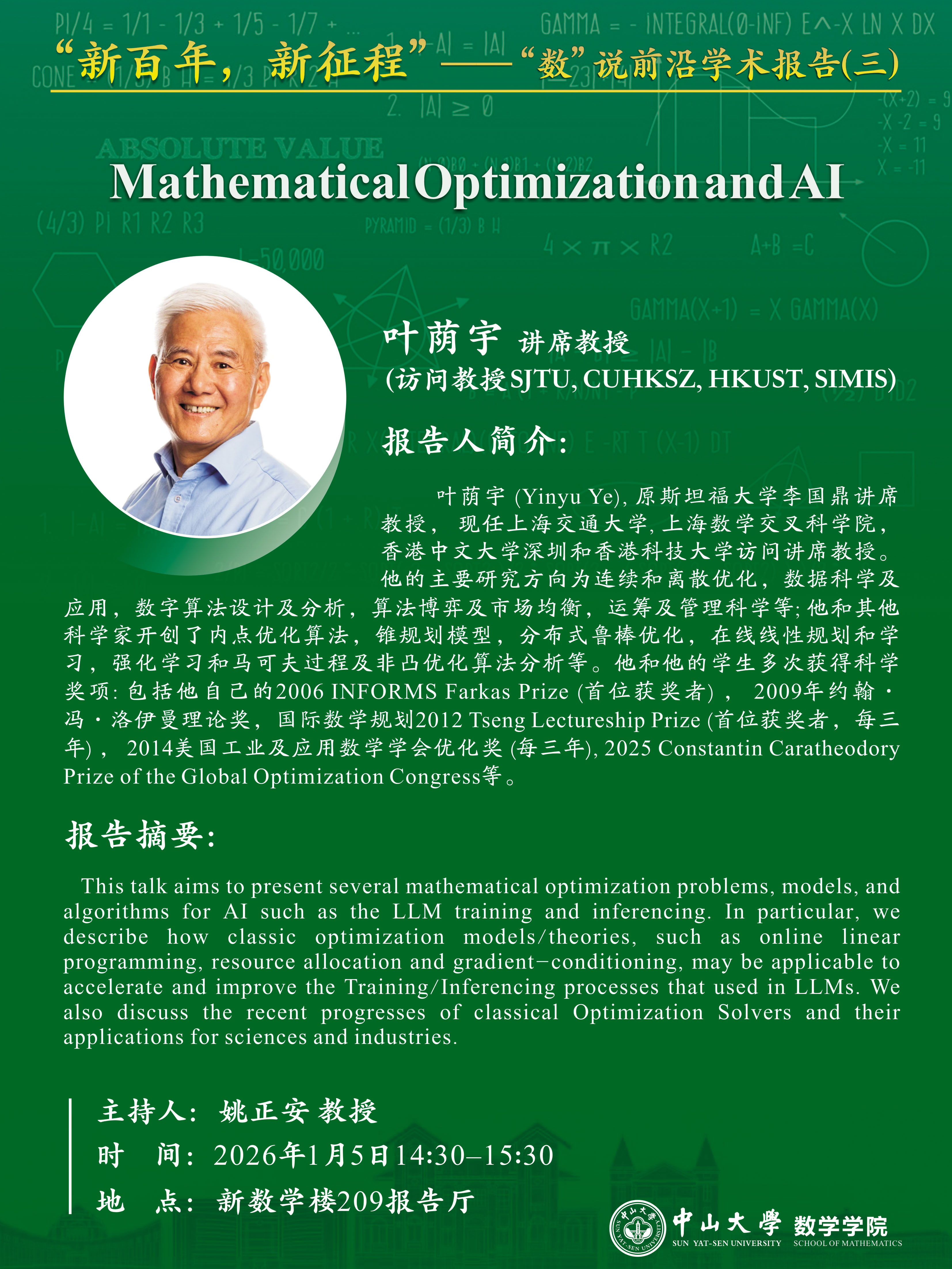 摘要:This talk aims to present several mathematical optimization problems, models, and algorithms for AI such as the LLM training and inferencing. In particular, we describe how classic optimization models/theories, such as online linear programming, resource allocation and gradient-conditioning, may be applicable to accelerate and improve the Training/Inferencing processes that used in LLMs. We also discuss the recent progresses of classical Optimization Solvers and their applications for sciences and industries.